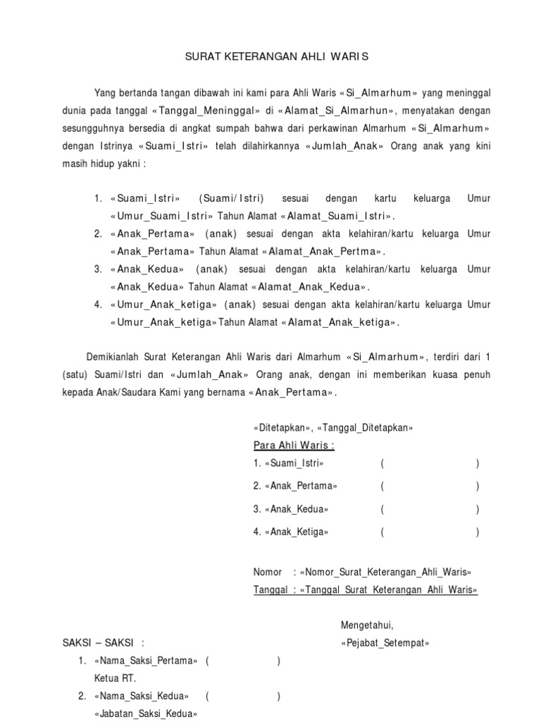 Begini manfaat dan cara pengurusannya untuk menghindari kerugian. Sebenarnya tidak ada peraturan hukum yang spesifik. Demikianlah surat keterangan ahli waris dari almarhum «si_almarhum», terdiri dari 1 (satu) suami/istri dan «jumlah_anak» orang anak, dengan ini memberikan kuasa penuh kepada anak/saudara kami yang bernama «anak_pertama». Surat keterangan ahli waris atau surat keterangan waris (skw) adalah surat yang dibutuhkan untuk melengkapi persyaratan atau kelengkapan administratif dalam urusan tertentu. Jadi di kantor kepala desa anda tinggal.